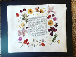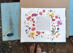 Bluth's Botanical Ketubah's are hand-crafted, scribed Ketubahs using earth based materials: klaf (hide/parchment) sourced from Meah Shearim; scribed with quill and ink; designed and beautified with natural materials - including pressed foraged flowers, upcycled floral arrangements, dried herbs, olive branches, and greenery from Israeli/ Palestinian landscapes. Each Ketubah is personalized, both in content and art. Bluth was trained in sofrut (scribal arts in Hebrew calligraphy) by Rav Dov Laimon, and simply adores plants.